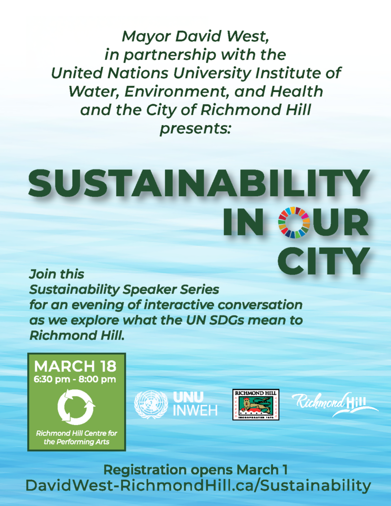 Together with subject matter experts from City of Richmond Hill staff, United Nations University Institute of Water, Environment, and Health, and knowledgeable community leaders, I am looking forward to hosting these casual community conversations as we gain a better understanding the UN SDGs (Sustainable Development Goals) and explore what our community believes sustainability looks like in Richmond Hill.