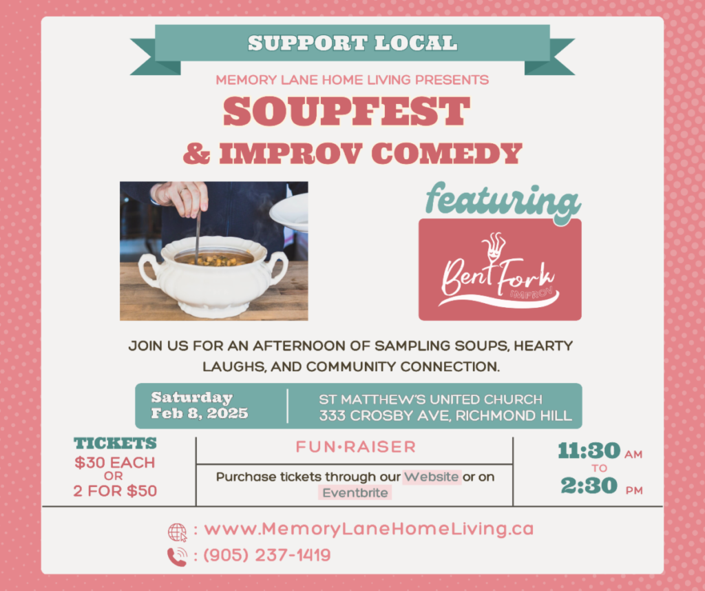 On Saturday Feb. 8th, in Richmond Hill, from 11:30 am to 2:30 pm, join Memory Lane Home Living for an afternoon of soup sampling, hearty laughs and community connection!