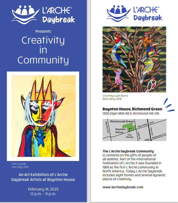 L’Arche Daybreak is excited to invite you to the “Creativity in Community” Art Show on Friday, February 14, 2025. You can drop by anytime between noon and 9 PM at the historic Boynton House, located at the northwest corner of Leslie Street and Elgin Mills Road (Richmond Green) in Richmond Hill.