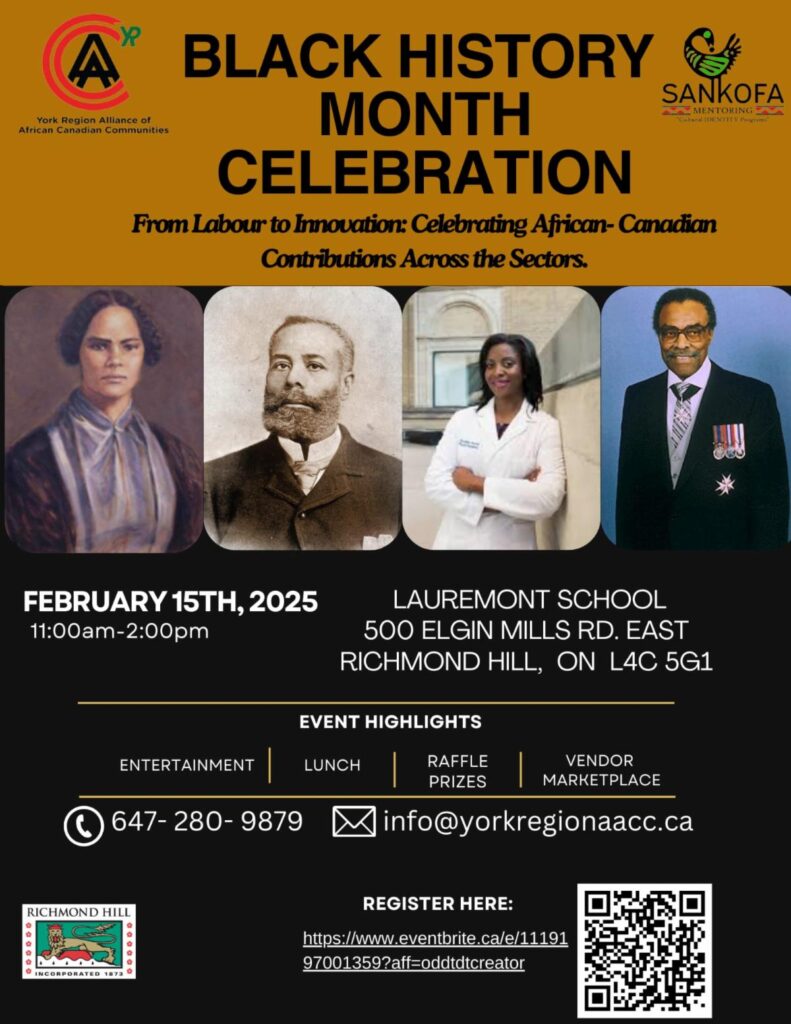 I look forward to joining the York Region Alliance of African Canadian Communities on February 15th at their Black History Month celebration. See the flyer below for all the details.