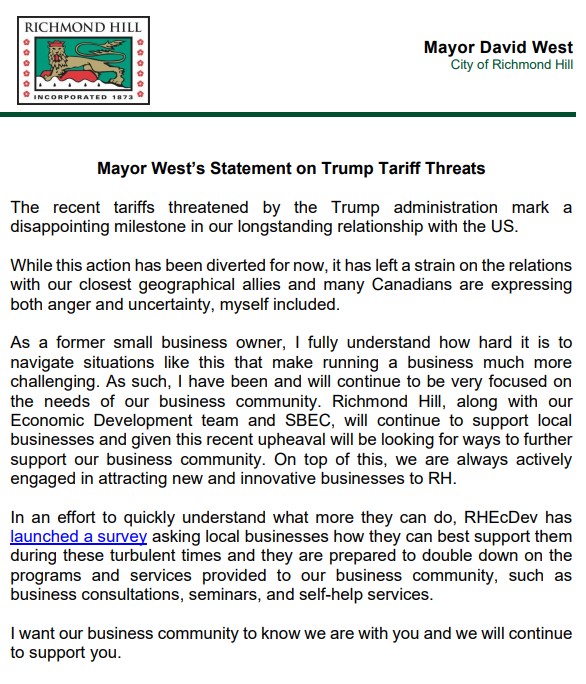 The threat of tariffs by the US this week galvanized me to exercise the control I do have to make a positive impact, locally. I am tabling a motion to adopt a ‘Made in Canada’ approach to our procurement processes at the City of Richmond Hill. Additionally I am redoubling my interest in the diversification in our business landscape and welcoming new businesses to Richmond Hill. The City of Richmond Hill Economic Development team is also continuing to actively support our business community with two initiatives, designed to address concerns about the business outlook. Read on to learn the details.